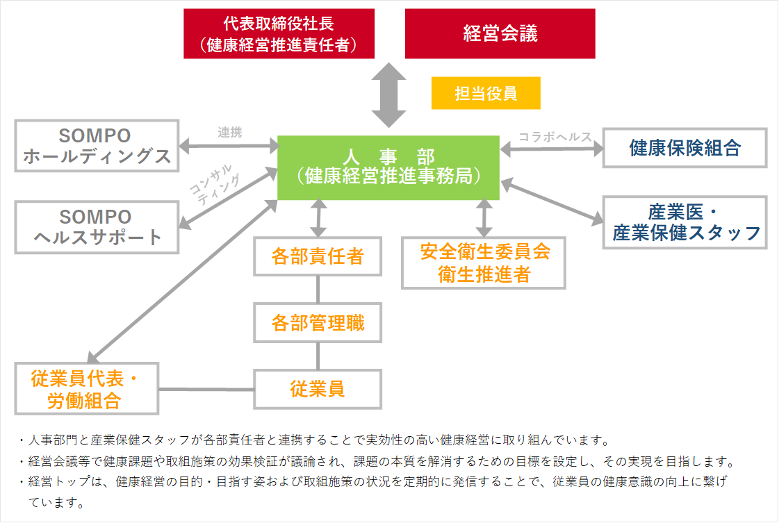 SOMPOグループは、「お客さまの安心・安全・健康に資する最高品質のサービスをご提供し、社会に貢献」するために、社員とその家族の心と体の健康を大切にします。